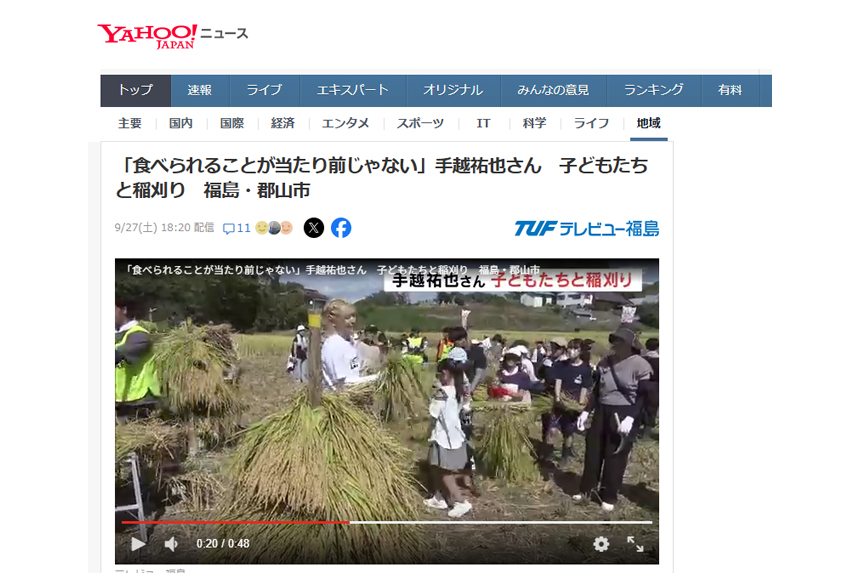 【YAHOO!ニュース】「食べられることが当たり前じゃない」手越祐也さん 子どもたちと稲刈り 福島・郡山市