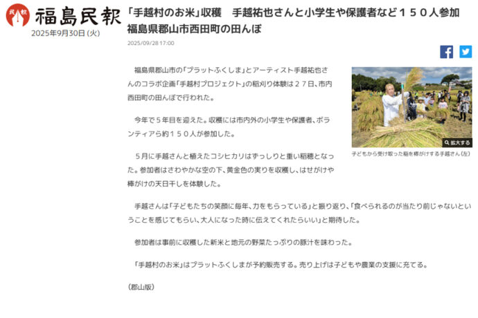 【民報】「手越村のお米」収穫 手越祐也さんと小学生や保護者など150人参加 福島県郡山市西田町の田んぼ