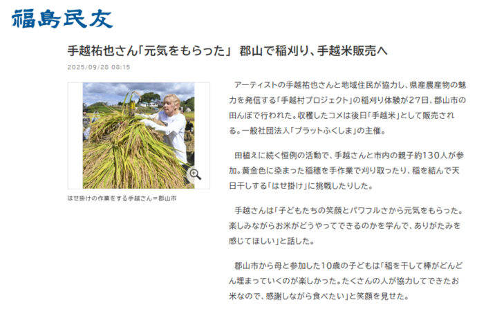 福島県産の農産物の魅力を発信する「手越村プロジェクト」の稲刈り体験が、9月27日、郡山市の田んぼで行われた。 「手越村プロジェクト」は一般社団法人「プラットふくしま」と手越祐也さんが、日本の農業文化を次の世代につなげよう…