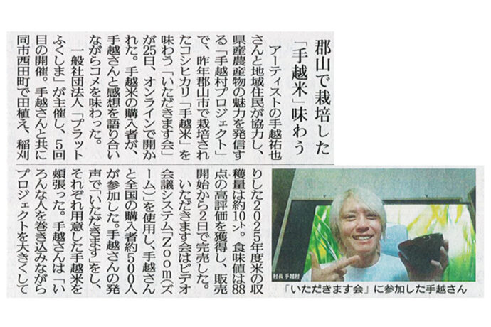 アーティストの手越祐也さんは2日、郡山市のプラットふくしまとのプロジェクト「手越村」の一環でつくった新米の「いただきます会」をオンラインで開いた。全国のファンらと同市西田町産のコメを味わった。 2021(令和3年)年から…